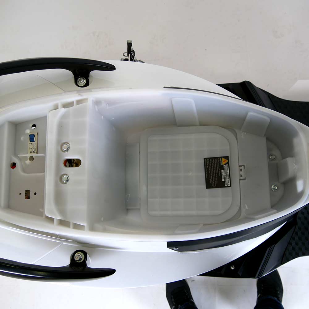 Le scooter électrique e-opai dispose d'un espace sous la selle. La batterie se trouve sous ce bac de selle.